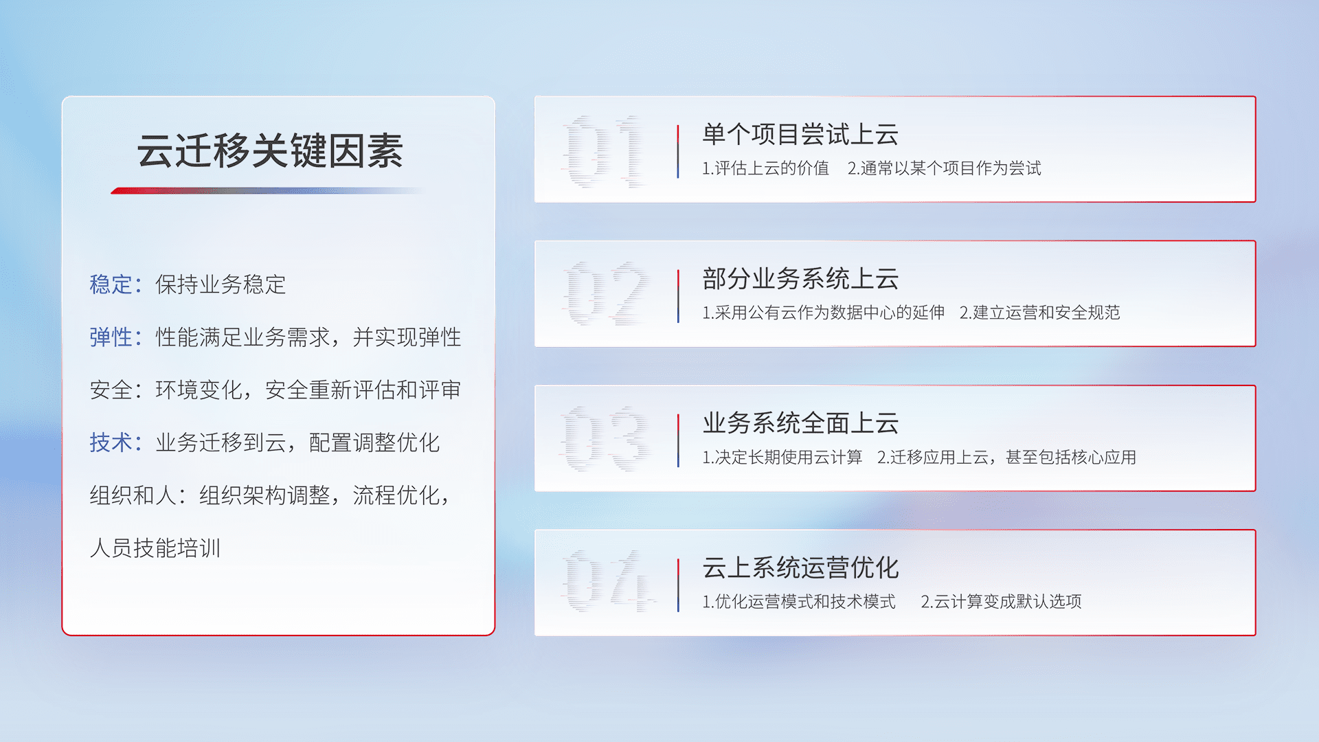 结合实际业务,,从规划设计、、、、云平台选型、、、云原生改造、、、、数据迁移、、、集成交付,,,迁移全过程为客户识别最佳上云路径,,,,做好风险识别管理,,,,设计网络架构、、身份权限、、、、安全审计合规、、、、操作审计、、日志审计、、监控告警策略、、、、多站点容灾设计等,,,对云上基础设施进行整体规划,,,提升IT治理水平,,,,以满足弹性、、、高可用、、、、高性能的需求。。